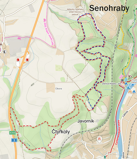 Značené trasy (značení v terénu stále doplňujeme, ale přírodní živly, kácení stromů, aj. značení bohužel v poslední době dost poznamenalo): červenou 8 kilometrová trať, modře 4 km jsou nyní i v aplikaci mapy.cz, neváhejte a vyběhněte, když se zratíte, tak se pomocí apky zase najdete.