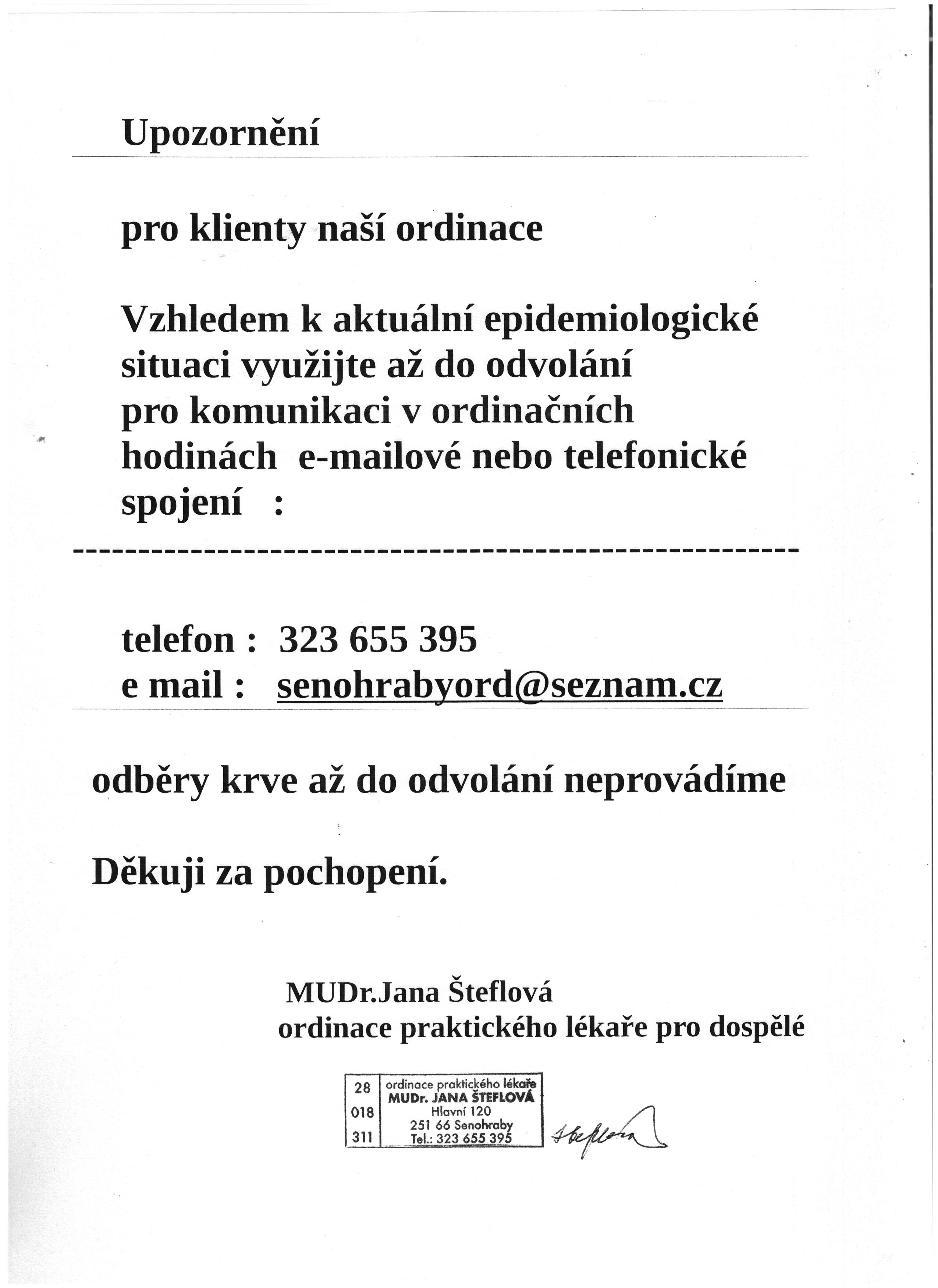 Praktická lékařka MUDr. Jana Šteflová žádá všechny pacienty o kontaktování předem telefonicky v ordinačních hodinách - tel.: 323 655 395, případně e-mailem na: senohrabyord@seznam.cz