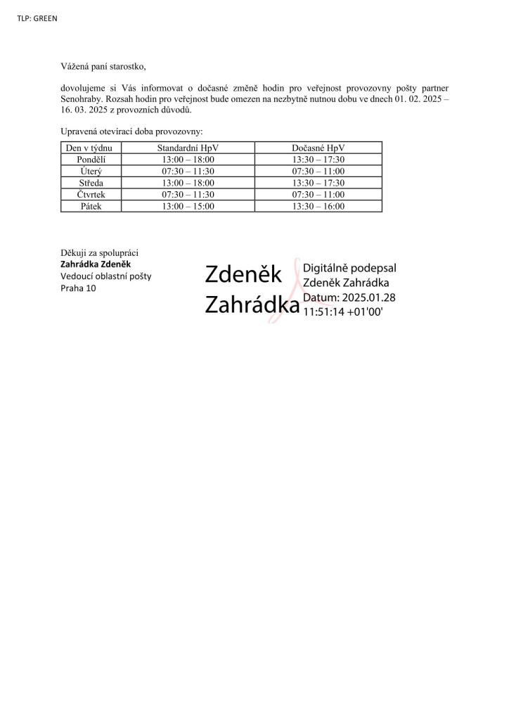 Upozorňujeme, že od 17. 3. 2025 dojde k trvalé změně hodin pro veřejnost Pošty Partner v Senohrabech. Více v příloze.