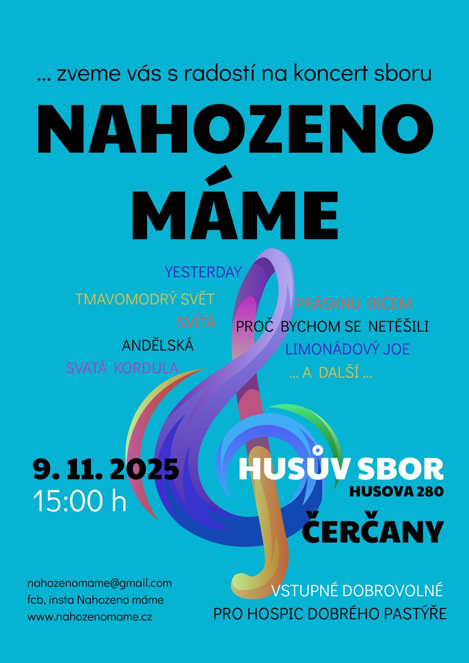 Koncert souboru Nahozeno máme se známými písněmi proběhne v neděli 9.11. od 15 hodin v Husově sboru v Čerčanech. Dobrovolné vstupné pro Hospic Dobrého pastýře.