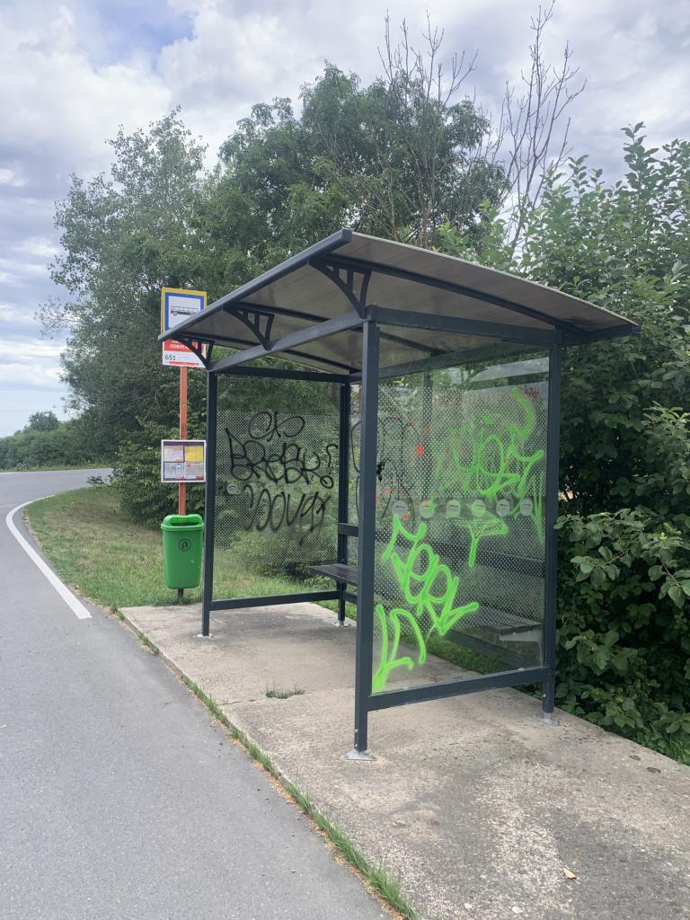 Posprejovaná zastávka autobusu za mostem a rozbité zrcadlo na křižovatce ulic Nad Stráněmi a Pětihostská.